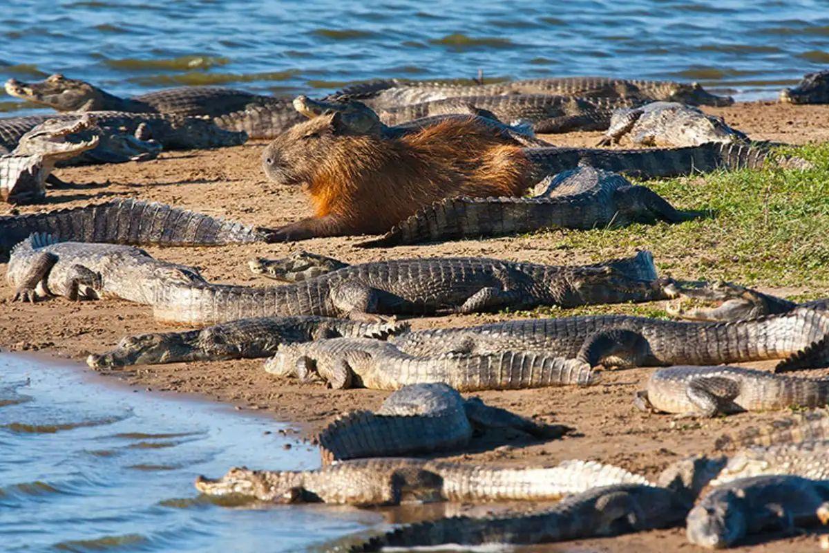 A imagem de animal zen não significa ausência de risco. A capivara divide habitat com jacarés e outros predadores, e essa convivência não é amizade, mas sobreposição de espaço.