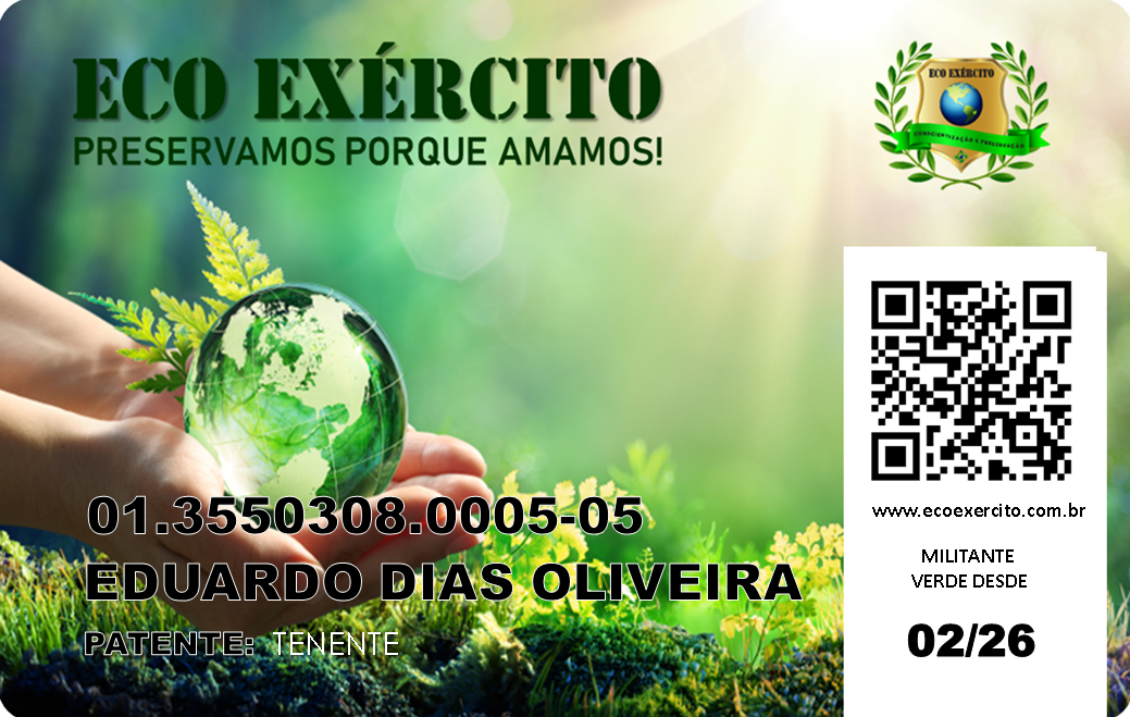 O ambientalista e morador do distrito Cidade Tiradentes, zona leste do município de São Paulo - SP, Eduardo Dias de Oliveira, por sua vasta experiência e atividades em projetos de conscientização e preservação do meio ambiente, o General da Natureza Sérgio Mendes o nomeou no mês de fevereiro de 2026, Tenente do ECO EXÉRCITO.